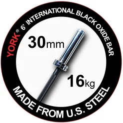 York Barbell 6 International Olympic Weightlifting Bar | Black Oxide – The YORK® Black Oxide International Weight Bars are finished with a black Oxide coating & feature hard chrome sleeves. It is a strikingly attractive weight bar. The black oxide finish has an aggressive grip and the steel for the bar is made in the USA with a minimum 100,000 tensile.