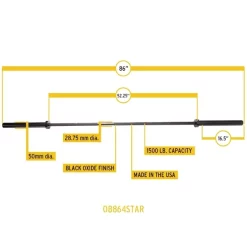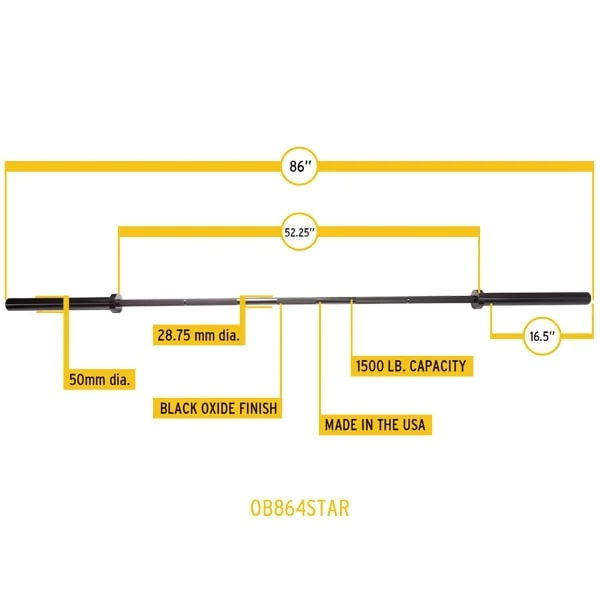 oxide weight plate sleeves. A medium diamond knurling is included throughout, including center knurl for those that prefer it for squatting or using it for certain types of one hand barbell lifts as well as single ring powerlifting hash marks. The OB864STAR includes a 1,500 lb. static load capacity with a steel tensile strength rated at 155,000 PSI. Weight sleeves rotate smoothly on bushings and are assembled using an interior snap ring design. Each bar comes with a Lifetime warranty against bending which is ideal for school weight rooms, CrossFit boxes and commercial gyms.