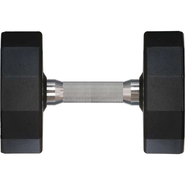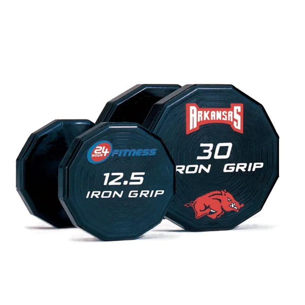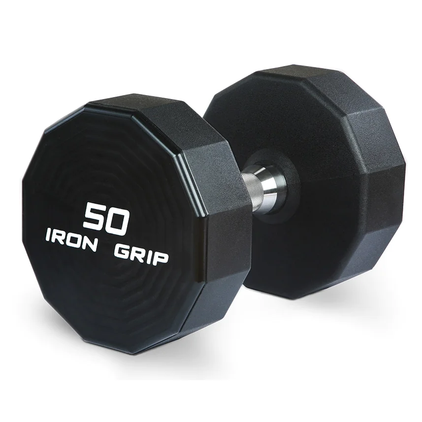 American Made Solid Steel Urethane Dumbbells | Iron Grip (UDBT) – Iron Grip UDBT American Made Urethane Dumbbells feature a Patented 12-sided dumbbell head to prevent unwanted rolling. Dumbbells are machined from solid steel, then press fit and fully welded, for maintenance free construction. Iron Grip urethane dumbbells are coated in impact resistant urethane, which can be laser engraved with your custom logo. And Iron Grip offers two handle choices for their urethane dumbbells, straight and contoured. Each handle is made froom high strength steel and coated in a durable hard chrome finish.