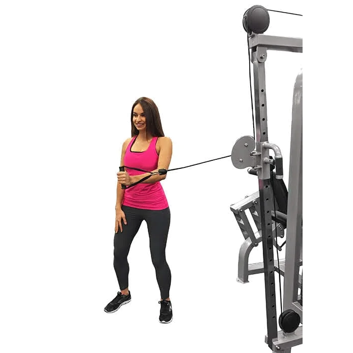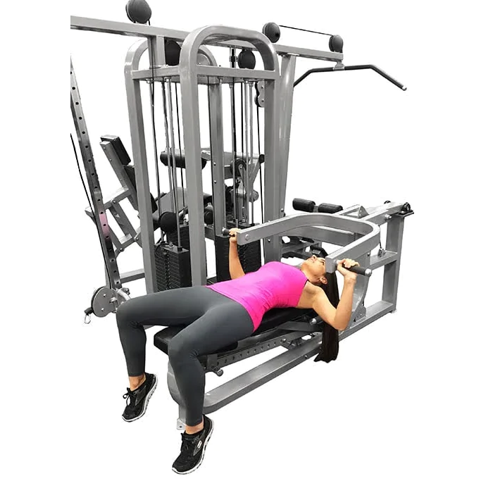 Compact 4 Stack Multi Gym – Muscle D Fitness (MDM-4SC) – The Muscle D MDM-4SC 4 stack multi gym is designed to provide cable machine workouts for up to four users at a time. It is also built to accommodate low ceilings making it perfect for home gyms, apartment buildings, hotel gyms or anywhere else tight on space. In order to jam pack as many resistance training exercises into the smallest footprint possible, Muscle D includes multiple combination exercise machines in the MDM-4SC. The lat pulldown / low row combo gives you two of the most effective back exercises for building and strengthening the low, mid and upper lats. The leg extension / leg curl combo works the quads and with a simple pop-pin adjustment changes over to seated leg curls for working the hamstrings. The innovative multi-press combines a flat and incline bench press for hitting the lower, mid and upper pec muscles and a seated shoulder press for isolating the side and front deltoids. Perhaps the most versatile station of the MDM-4SC is the adjustable hi / low pulley system. The integrated handle and pop-pin allow users to quickly and easily slide the swivel pulley the complete length of the chrome pulley column selecting any one of the multiple adjustment heights along the way. Use the adjustable hi / low pulley for a multitude of upper and lower body cable exercises.