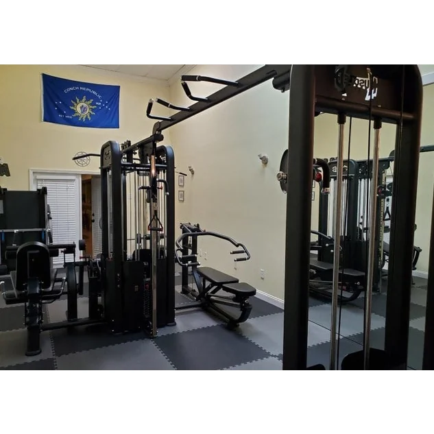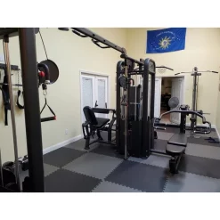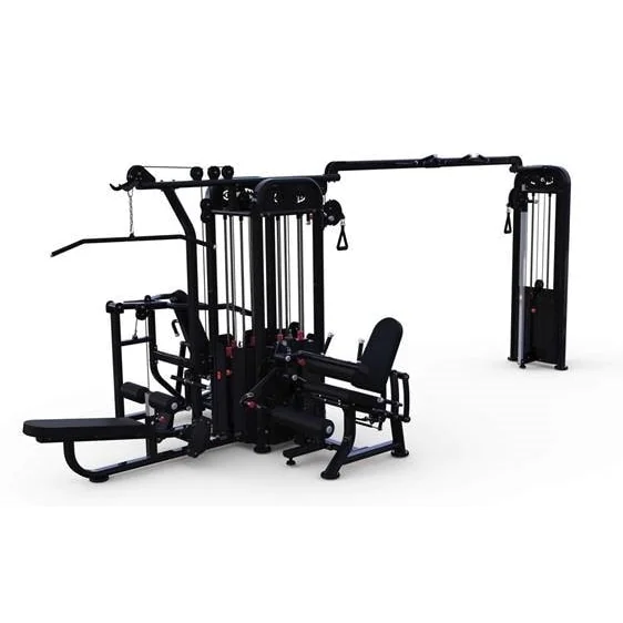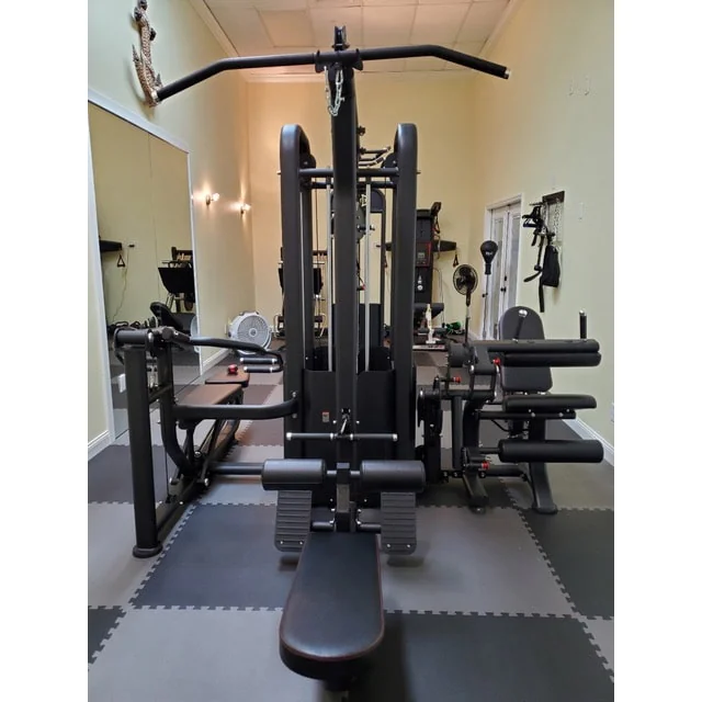 Compact 5 Stack Black Frame Multi Gym – Muscle D Fitness (MDM-5SCB) – The Muscle D MDM-5SCB compact 5 stack black frame multi gym allows up to 5 users to train at once plus a sixth that can use the centrally located chin-up bars for back training or as a suspension trainer anchor point for bodyweight training exercises like chest presses, bicep curls, tricep extensions, pistol squats and more. The two adjustable hi / low pulleys are ideal for cable crossovers from various heights to isolate the lower, mid and upper pecs. They can also be used separately by two users for a multitude of pulley machine exercises for the upper and lower body. A leg extension / leg curl combo is a great quad and hamstring developer and changes over from one exercise to the other through simple pop-pin adjustments. The multi press machine adjusts from flat bench to incline bench to seated shoulder press all in one small footprint and combined are some of the most effective muscle and strength building upper body exercises you can do. And the lat pulldown / lat row combo hits all the vital areas of the back including the low, mid and upper lats. Changing from pulldowns to rows is as easy as grabbing either of the cable attachments. No cable changes needed!