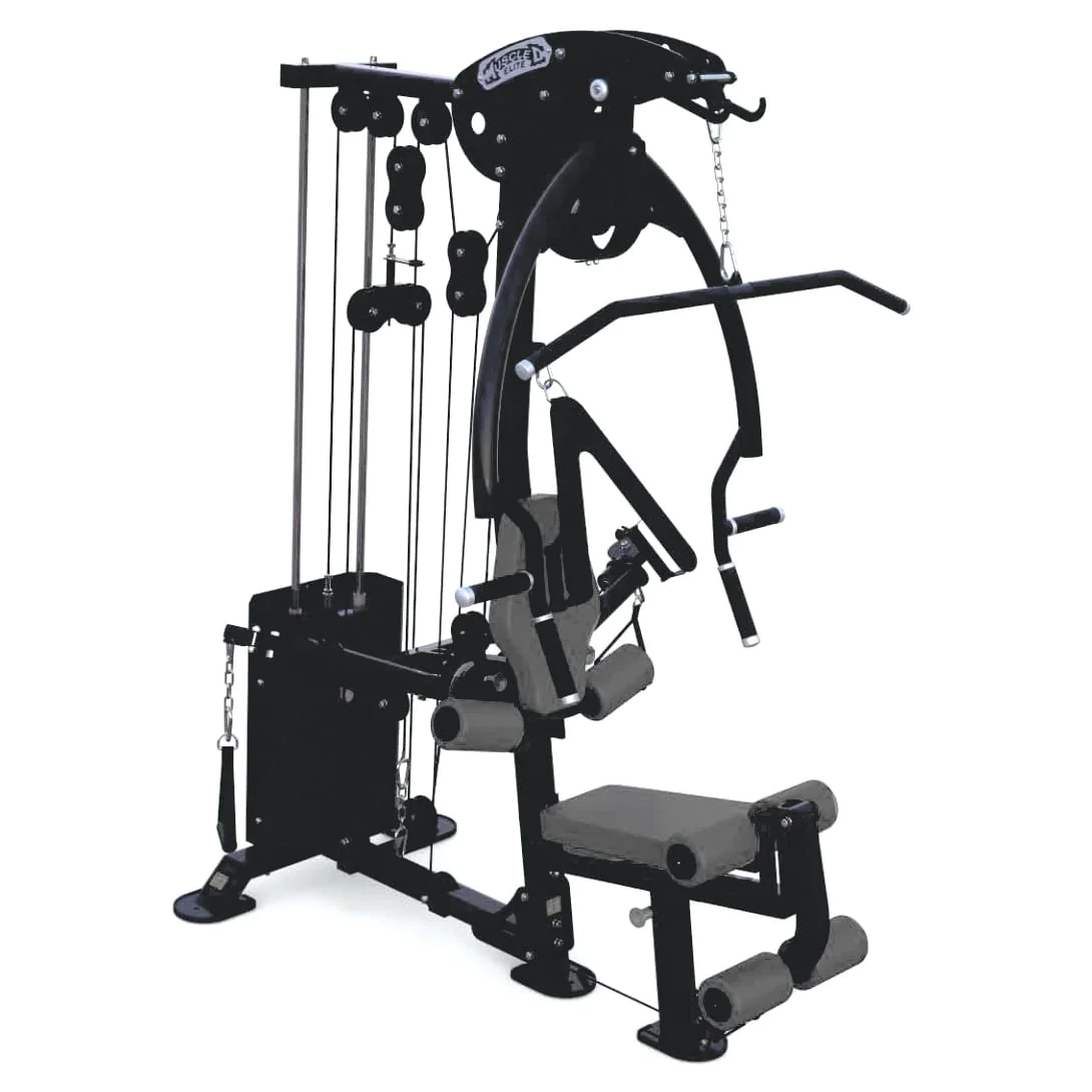 Muscle D Fitness Compact Single Stack Multi Gym – The MDM-1CSSM Multi Gym is a compact cable machine gym with single 200 pound weight stack that can be placed against a wall to maximize space efficiency in an home gym, hotel fitness center, condo workout room, or other commercial gym setting. The MDM-1CSSM is a modern take on a familiar and classic home gym design, but has added commercial framing and components to beef it up for durability and enhanced workout experience. At nearly 550 pounds standing weight the MDM-1CSSM outweighs and outperforms nearly all gyms of this size. All your favorite quintessential exercises are present including seated chest press, lat pulldown and tricep pressdown, seated leg extension and standing leg curl, and seated ab crunch. From here the MDM-1CSSM offers additional versatility. Not only can the press arm can be adjusted for pre-stretch, but it can be locked farther back into the machine so the exerciser can turn around and perform seated rows using a horizontal or vertical grip. The Crossover Chest Pulley arms are adjustable in height to also serve as dumbbell curl or upright row handles from a lower position, or tricep extension handles from an upper position. Face the seat pad to perform rear deltoid extensions. The best thing about this machine is that no cable changes are required! Want to customize the look of your home gym or make it stand out in a workout room? The MDM-1CSSM includes full cushion sets (seat pad, back pad, and roller pads) in both black and red free of charge so you can assemble to best suit your personal color preference.