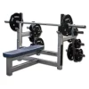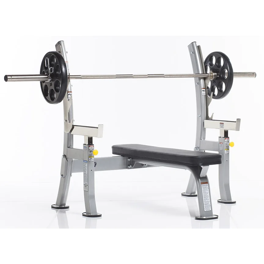 TuffStuff Fitness Evolution Series Olympic Flat Bench with Safety Spotters What is the best gym equipment for the barbell bench press? The Flat Bench Press is the most basic and quintessential weight training exercise for developing overall chest strength, size, shape, and explosive power. The COB-400 by TuffStuff has three gun rack style bar catch positions for safety while beneath a loaded Olympic weight lifting bar or power lifting bar. The adjustable safety spotters on this free weight bench can be positioned at different heights to allow for additional safety while benching or for use during controlled pause repetitions.