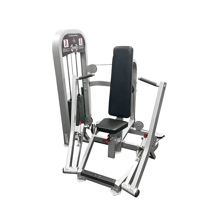 Iso Lateral Chest Press – Muscle D Fitness (MDC-1001) – The Muscle D Iso Lateral Chest Press Machine allows the user to perform simulated bench presses in an upright seated position. Similar to dumbbell chest presses, the arms on the Muscle D chest press move independently making sure that each arm pushes with the same amount of force as the other. This independent design combined with converging handles ensures better isolation and contraction of the pectoral muscles. The Muscle D selectorized chest press includes polished guide rods and precision bearings for long lasting, consistently smooth performance. A 200 lb. weight stack is conveniently located for quick weight changes and is surrounded by a heavy-duty 11-gauge rectangular steel tube frame that adds strength and stability to even the heaviest workouts. And a precision air-lift seat is included for one-handed seat height adjustments.