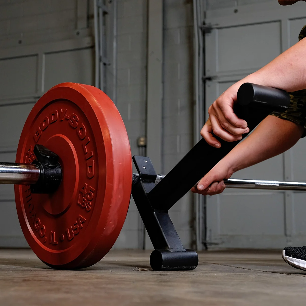Body-Solid Tools BSTOBJ Olympic Bar Jack β The Body-Solid BSTOBJ is a deadlift jack used to elevate an Olympic barbell so that bumper plates and other weightlifting plates can easily and efficiently be loaded and unloaded without making contact with the floor. The BSTOBJ Olympic Bar Jack is simple and safe to use. Simply position the jack under the bar shaft on the inside of either sleeve collar, then press down on the back of the handle. Alternatively, in the case of a very heavy load, you may also step down upon the back of the handle, employing the stronger leg muscles to provide the counter force. Using simple leverage, the jack will roll back and upwards upon the tubular fulcrum, elevating the bar a few inches to provide clearance between the plates and ground. This effective tool can lift up to 500 pounds per side with minimal effort. This shortens the time needed between sets to add or decrease weight, especially when changing between two different lift loads for workout partners of different strengths sharing the same bar in a crossfit workout or other group fitness setting. The smaller BSTOBJ Olympic Bar Jack is much more space efficient and portable than a full size jack. Use as a single to elevate one side of the bar, or combine two BSTOBJ Olympic Bar Jacks to elevate the entire Olympic bar at once.