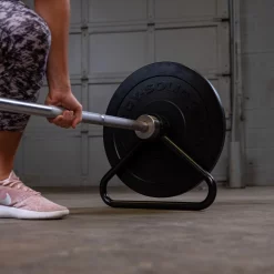 Body-Solid Tools BSTOBS Olympic Bar Stand (Pair) β The Body-Solid BSTOBS Olympic Bar Stands are designed as built-in bar jacks which when attached to both sides of an Olympic barbell, Olympic hex bar, or Olympic trap bar will elevate the resting height of the bar enough to allow clearance between weight plates and floor for easy loading and unloading. To use the BSTOBS Olympic Bar Stands, slide each stand down the Olympic bar sleeve so that they are positioned against the inside collar. Using an allen wrench, secure each stand clamp tightly to form a compression lock against the bar sleeves. The Olympic Bar Stands work best with a dedicated deadlift bar, since they are not meant to be taken on and off between sets. When both sides are secured to bar sleeves, the Olympic bar shaft will then be elevated 10 inches from the ground, which allows bumper plates and other full size weight plates to rest on the bar sleeves with at least 1-1/2 inches of clearance from the floor. This allows safe and easy loading and unloading of weight plates at the start of the workout, between deadlift sets, and at the end of the workout.