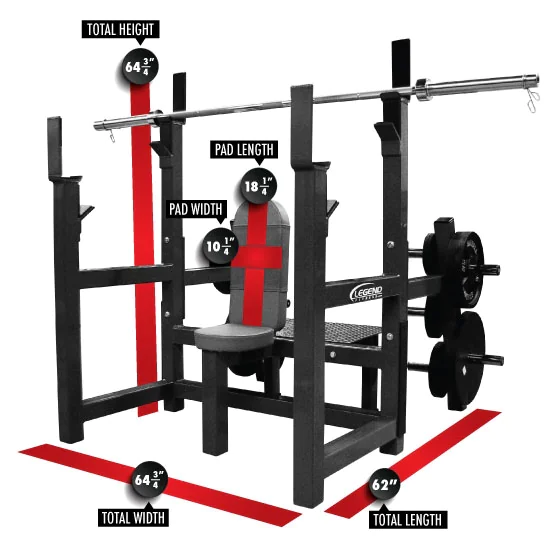 Legend Fitness 3156 Olympic Shoulder Press Bench with Weight Plate Storage- The 3156 Olympic Shoulder Press by Legend Fitness is a commercial shoulder press rack that is constructed like a power cage with a built-in seat for maximum safety during seated shoulder presses. Its oversized frame is fabricated using only 3 x 3 x 11 gauge steel that is both mig welded and bolted. The lifter has access to two sets of uprights for various shoulder training exercises. The front uprights feature a top bar catch as well as a lower bar catch for added safety on a missed rep. The front uprights are ideal for performing seated barbell military presses with an Olympic bar. The rear uprights are similar in design but positioned a few inches higher to accommodate behind the head barbell presses and overhead presses. Situated on each side of the cockpit are the 3 x 3 safety arms. Similar to a power cage, the safety arms provide an added level of safety to the lifter in case of a missed rep. The built-in seat is fully welded to the frame for added durability and stability during the heaviest lifting sessions. Legend uses only top quality padding which in this case consists of 2 thick rebond foam with a density rating of 8 lbs. per cubic foot. What this means to the lifter is a fully supportive foundation that doesnt bottom out on the 3/4 plywood backerboard underneath! And perhaps one of the biggest benefits the 3156 provides is the ten weight plate storage pegs in the back. No more hunting down plates between sets! Choose from several chip resistant powder coat colors and naugahyde colors at no upcharge. Need a custom color? Contact an Ironcompany Legend Strength Equipment specialist today.