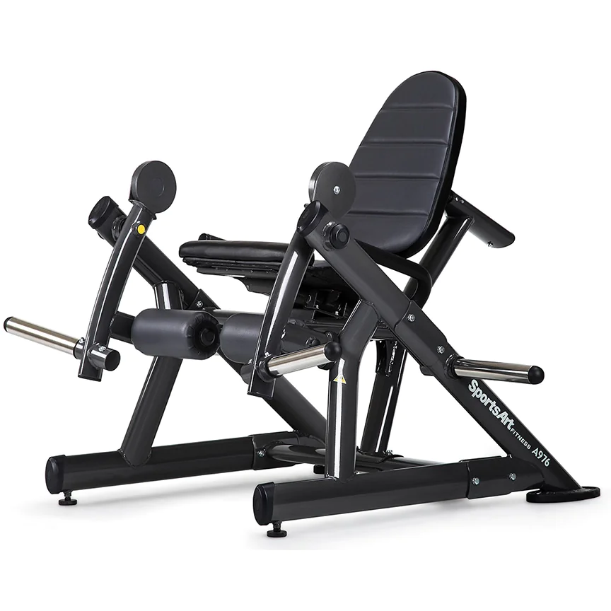 SportsArt A976 Plate Loaded Series Leg Extension Machine – The A976 Leg Extension from SportsArt Fitness is a commercial plate loaded strength machine for lower body training which targets and develop the quadriceps muscles of the upper leg. The leg extension exercise for quads is performed on the A976 in a seated position at a slight angle to reduce lower back stress. Thickly cushioned roller pads ensure comfort on the ankles and lower shin during extension of the leg. Since the leg lever arms move independently of one another, the user can either perform a dual leg extension with both legs engaged at once, or single leg extensions for isolation of the quadriceps muscle on one side only. The adjustable back pad means a broad range of user heights can be accommodated. The A976 Plate Loaded Leg Extension Machine allows you to use Olympic plates with a 2″ center hole for resistance. Load your plates onto the angled weight horns on each leg lever arm. The upward angle keeps plates safely in place during use. The A976 has a 500 pound maximum weight load rating for heavy duty leg training. The welded heavy-duty steel frame has stylish, sleek lines and curves created through oval tube steel. Major frame pieces bolt together allowing easier transport prior to assembly. Electrostatic powder coating insures the finish is resistant to scratches and dings for a long term beautiful finish. Heavy-duty vinyl cushions are comfortable and durable for club use. Rubber non-skid feet cover base frame supports to avoid sliding of machine or scratching of floors. All components are commercial grade on SportsArt’s world-class health club strength products to make the A976 Leverage Leg Extension Machine perfect for any commercial gym, fitness center, home gym, hotel workout center, personal training studio, or corporate wellness facility. The SportsArt Plate Loaded Series combines quality and value in a simple, easy-to-use free weight strength line designed to accommodate users of any fitness or experience.