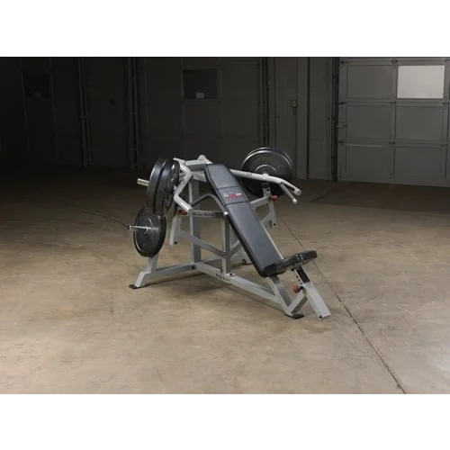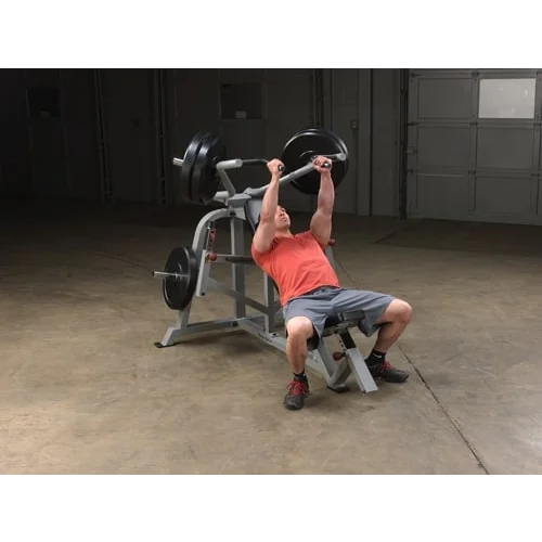 Body-Solid LVIP Pro ClubLine Leverage Incline Bench Press β The LVIP Leverage Incline Bench Press by Body-Solid is a commercial rated strength machine which uses plate loaded resistance and leverage movement to isolate and strengthen the upper pectoral muscles of the upper body when performing the incline bench press exercise. The Body-Solid LVIP provides the natural feel and resistance of free-weights with the control of a machine. The press arms have two sets of handles allowing both wide grip incline press as well as close grip incline press for upper chest, front deltoids, and triceps. The LVIP offers unilateral and converging motion with each press arm working independently for better muscle isolation and contraction. Load up this machine with Olympic weight plates or Olympic bumper plates for resistance, and store them on the convenient weight storage posts located at the sides of the press arms when not in use. The LVIP Leverage Incline Bench Press is perfect for any commercial gym, school weight room, personal training studio, or garage gym at home.