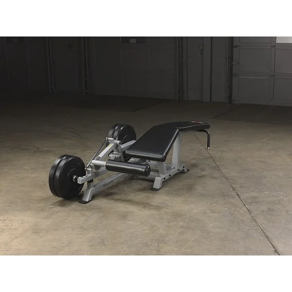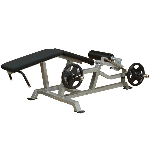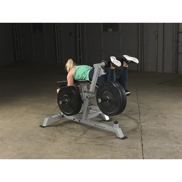 Body-Solid LVLC Pro ClubLine Leverage Leg Curl β The LVLC Leverage Leg Curl by Body-Solid is a commercial rated strength machine which uses plate loaded resistance and leverage movement to isolate and strengthen the hamstring muscles of the lower body when performing the lying leg curl exercise. The Body-Solid LVLC provides the natural feel and resistance of free-weights with the control of a machine. The direct link movement arm allows a full and continuous range of motion and the downward angled V-bench design reduces stress on the lower back as well as forces on the knees during heavy sets. Load up this machine with Olympic weight plates or Olympic bumper plates for resistance, and store them on the convenient weight storage post at the front of the machine when not in use. The LVLC Leverage Leg Curl is perfect for any commercial gym, school weight room, personal training studio, or home gym.