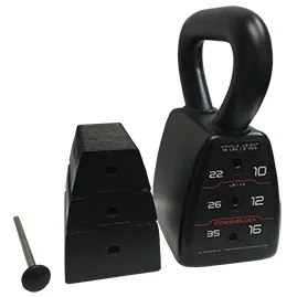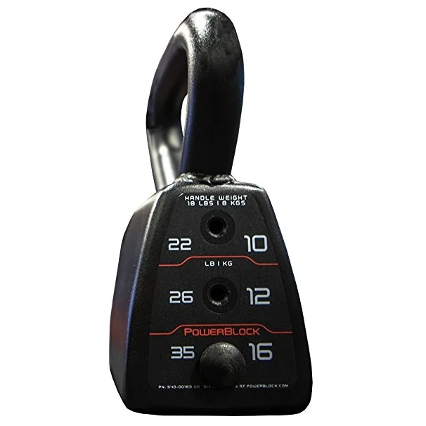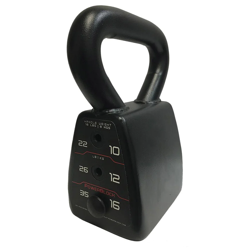 PowerBlock Adjustable Kettlebell – The Adjustable Kettlebell from PowerBlock is a selectorized cast iron kettlebell offering 4 different weight increments from 18 lbs to 35 lbs in a single unit. The PowerBlock Adjustable Kettlebells replaces 4 individual kettlebells, or 101 pounds of free weights while taking up the space of just one kettlebell. If you are thinking about buying several kettlebells for a kettlebell training routine at home for strength and conditioning, consider the efficient and space saving design of the PowerBlock Adjustable Kettlebell. This high quality kettleblock features a thick solid cast iron handle and welded shell design for durability. Unlike other selectorized kettlebells that may be bulkier or have an odd shape throwing kettlebell execution out of proper balance and form, the PowerBlock Adjustable Kettlebell features a curved outer shell and compact, ergonomic design for comfortable movement during exercise.