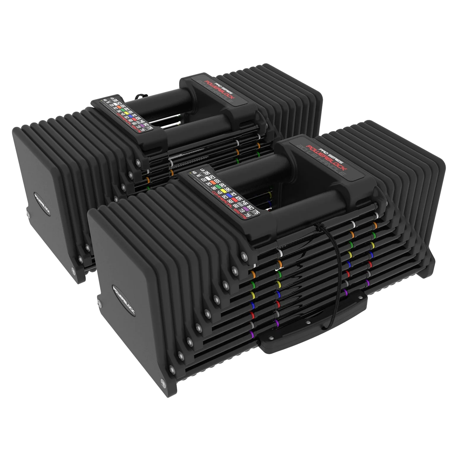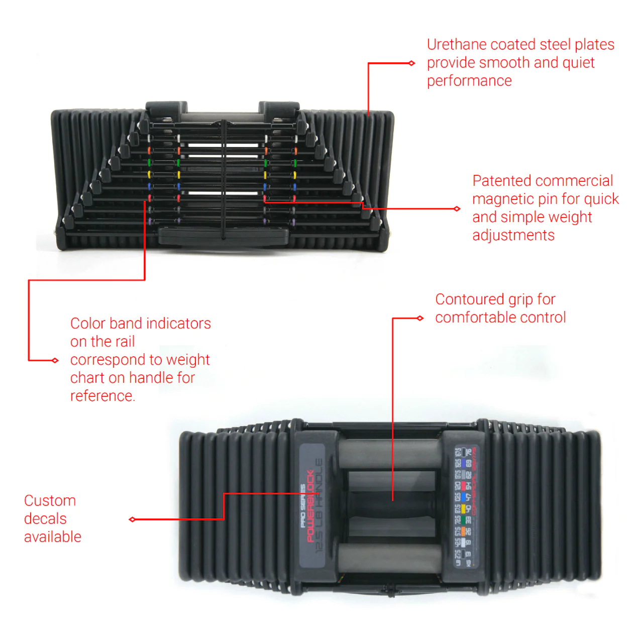 PowerBlock Pro 175 Commercial Dumbbell Set with Pro Max Stand | PowerBlock (PRO-175) – The PowerBlock Commercial Pro 175 dumbbells feature a 12.5-175 lb. weight range in 7.5-10 lb. increments, equivalent to 22-pairs of traditional dumbbells. Despite the massive amount of weight, the Pro 175 is surprisingly compact, coming in at only 19” x 8.5” x 9” each (fully loaded) with a total footprint of 21.5″ x 25″ when racked on the included Pro Max Dumbbell Stand with Caster Wheels. The Pro 175 is the heaviest adjustable dumbbell available providing ample resistance for even the strongest athletes to perform presses, rows, shrugs, squats, lunges or any other dumbbell exercise. Weight changes for drop sets and between sets are quick and easy thanks to the Zytel magnetic selector pin. Changing the resistance is as easy as changing the resistance on a weight stack machine at the gym. An upgraded PowerBlock Max Rack Stand dumbbell rack with casters is included with each purchase of Pro 175 dumbbells for space efficient storage and easy mobility. Optional accessories include the PowerBench Weight Bench. The commercial line of PowerBlock Pro selectorized dumbbells are the only adjustable dumbbell specifically designed for commercial use making them an ideal investment for schools, pro sports teams, commercial gyms and military installations. Each PowerBlock Pro 175 purchase comes with a Pro Rack Stand that is compact to fit just about anywhere, including between power racks.