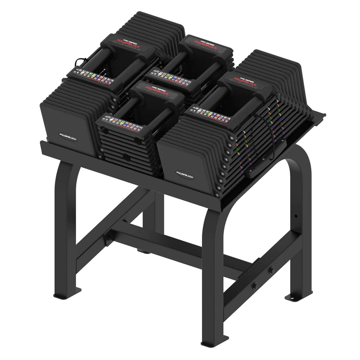 PowerBlock Pro Max Stand with Casters – Each PowerBlock Pro 175 Dumbbell Set comes with an upgraded Pro Max Stand with Casters. The Pro Max Stand rolling dumbbell rack provides functional storage and mobility that fits next to any Power Rack or Weight Bench while taking up minimal space. The lower tray can hold another set of dumbbells, battle rope, or the PowerBlock Adjustable Kettlebell to add diversity and organization. The Pro Max Stand Dumbbell Rack with Commercial Casters turns the equivalent of two tons of dumbbells into a mobile training unit and can be easily relocated to any location of your facility. Commercial grade casters make it easy to roll on different types of flooring including rubber mats and wheels can be locked in place to prevent rolling.