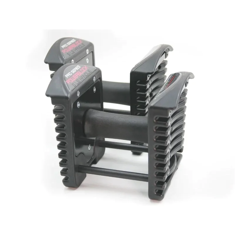 PowerBlock Pro 50 Commercial Dumbbell Set with Pro Rack Stand | PowerBlock (PRO-50) – The PowerBlock Commercial Pro 50 dumbbell set is equivalent to a 10-50 lb. dumbbell set in 5 lb. increments condensed into a single pair of dumbbells for the ultimate in space and cost savings. Weight changes are quick and easy thanks to the Zytel magnetic selector pin. The PowerBlock Pro 50 is the only selectorized dumbbell specifically designed for commercial use making it ideal for schools, pro sports teams, commercial gyms and military installations. Each PowerBlock purchase comes with a Pro Rack Stand that is compact to fit just about anywhere, including between power racks.
