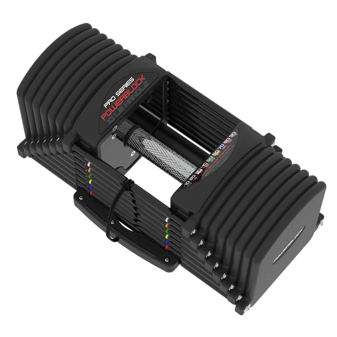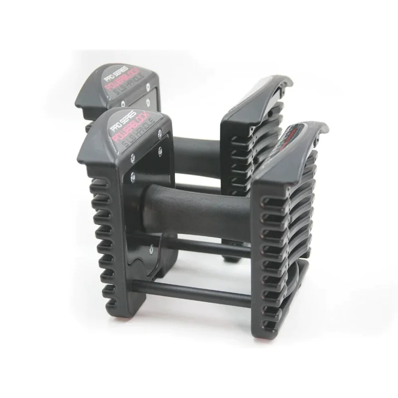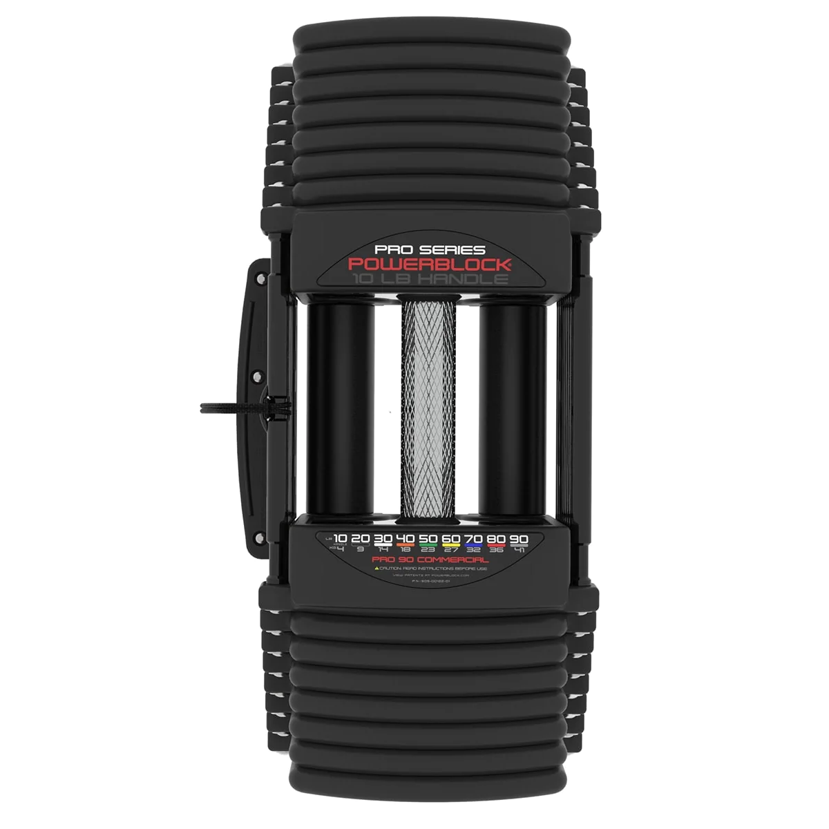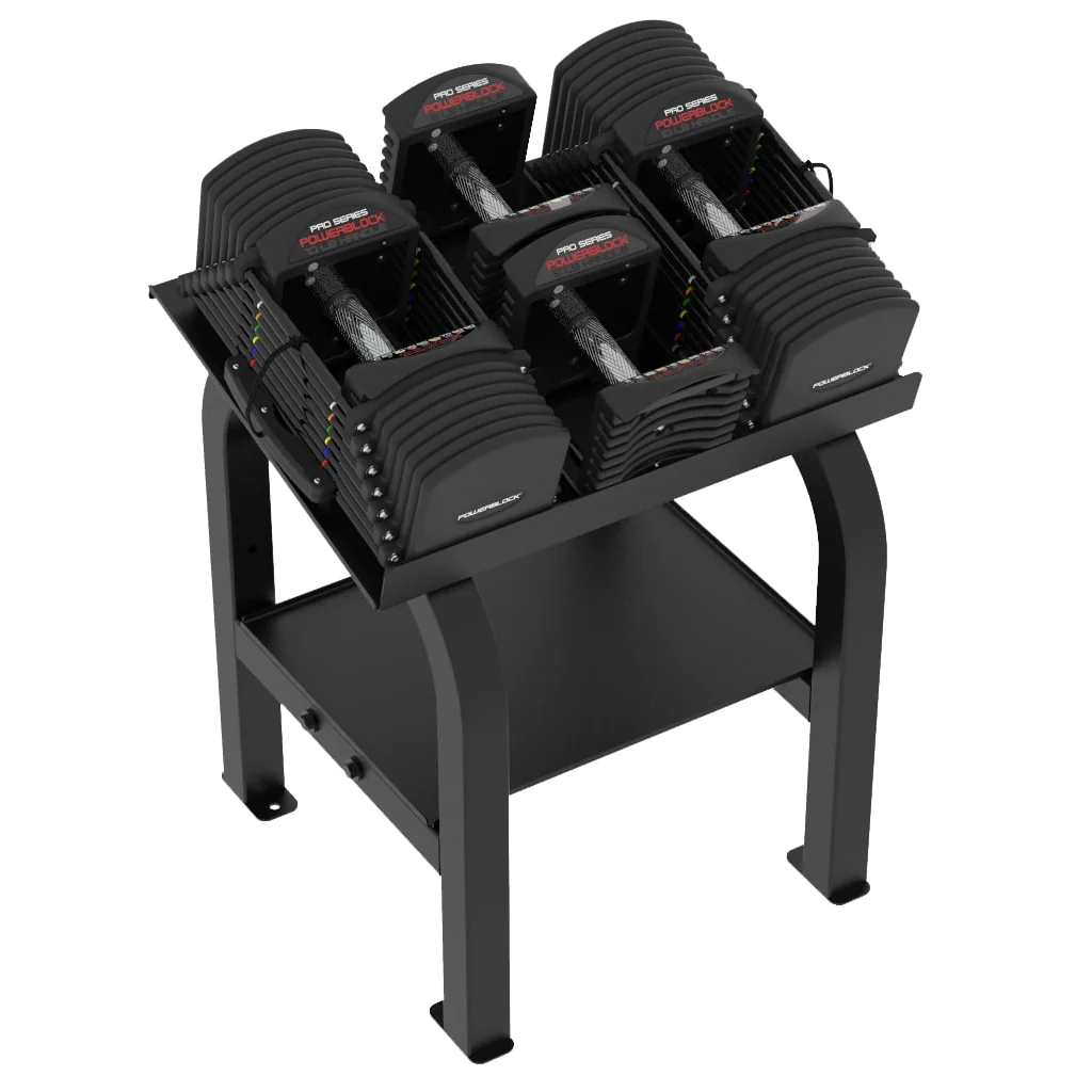PowerBlock Pro 90 Commercial Dumbbell Set with Pro Rack Stand | PowerBlock (PRO-90) – The PowerBlock Commercial Pro 90 dumbbell set is equivalent to a 5-90 lb. dumbbell set in 5 lb. increments condensed into a single pair of dumbbells making it ideal for those short on space or with a restricted budget. The Pro 90 hits the sweet spot for commercial dumbbell workouts giving most trainee’s more than enough resistance for increasing strength in presses, rows, lunges and more. Thanks to the Zytel magnetic selector pin, weight changes on the PowerBlocks are quick and simple, much like changing the resistance on a weight stack at the gym. The commercial line of PowerBlock Pro dumbbells are the only selectorized dumbbell specifically designed for commercial use making them an ideal investment for schools, pro sports teams, commercial gyms and military installations. Each PowerBlock Pro 90 purchase comes with a Pro Rack Stand that is compact to fit just about anywhere, including between power racks.