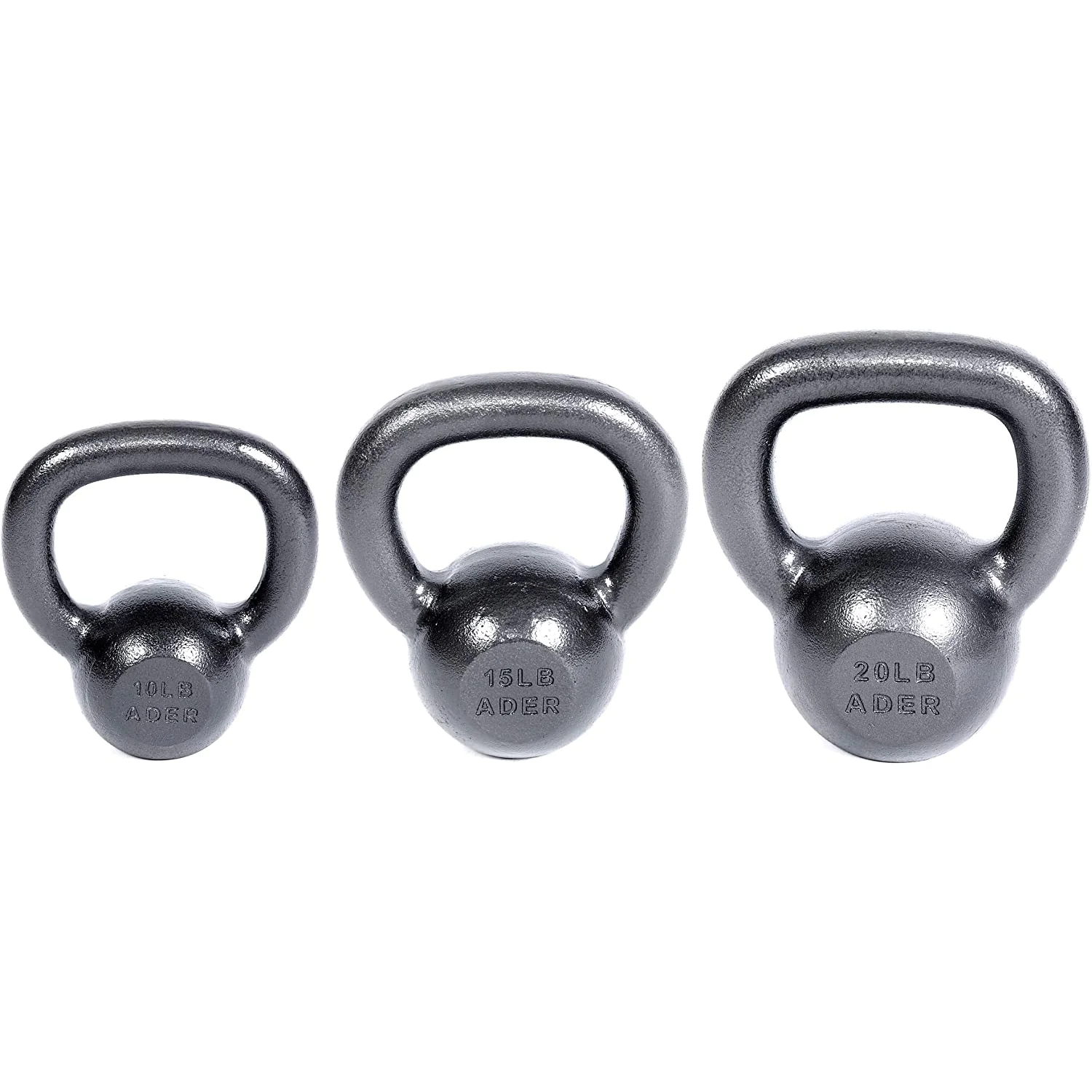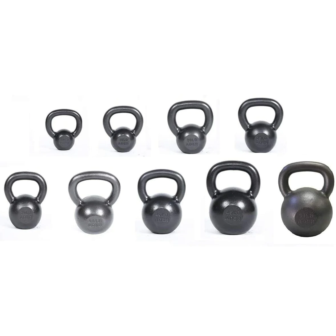 Ader Premier Cast Iron Kettlebell Set for CrossFit – Ader Fitness Kettlebells are regarded as among the best kettle bells made today for crossfit workouts, sports performance training, functional training, group exercise, and personal training. If you’re building your own garage gym then a set of Ader kettlebells is hands down one of the best equipment investments you can make. Whether you’re into “Hardstyle”, “Girevoy” or “CrossFit” style lifting, a quality iron kettlebell set combined with a consistent, well-rounded training program can produce tons of benefits including increased strength, lean muscle gains and ramped up cardio conditioning. Ader bells offer a consistently smooth handle texture with no rough casting seams, burs or any other obstruction that has the potential to tear up your hands during high rep WOD training. Lighter kettlebells will accommodate people of all sizes and strength levels that wish to perform 22 and 30 rep WOD rounds as well as the 5 minute 100 rep snatch test which is a requirement for certain kettlebell certifications such as RKC and StrongFirst. And for the heavy kettlebell lifter that wishes to ramp up their strength levels, the 80, 90 and 100 lb. bells are heavy enough to sufficiently challenge most.