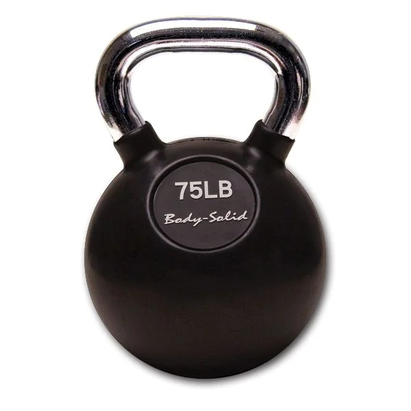Body-Solid KBC Premium Kettlebells with Chrome Handles β KBC Rubber coated kettlebells with chrome handles by Body Solid are encased in thick virgin rubber to be impact resistant on floors and surrounding equipment as well as protect the kettlebell body itself from scratches and rust. Body Solid rubber kettlebell sets are many times more durable than neoprene or vinyl coated kettlebells and are ideal for commercial environments such as gyms and Crossfit boxes. The virgin rubber is impervious to moisture and resists cracking and drying out over time. Another unique feature of the Body Solid rubber kettlebell is the smooth chrome kettlebell handle. Unlike iron kettlebells which may have burrs, rough areas, or other imperfections from casting on the handles, Body-Solid KBC Kettlebells have smooth, chrome plated handles which allow comfortable grip and easy rotation for swings. The chrome plating is near impossible to chip, meaning your kettlebells will look and feel new for years to come.