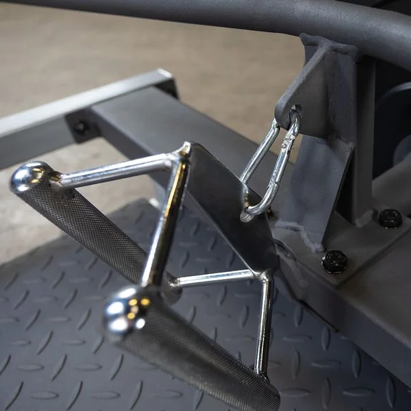 The 42.5″ wide, angled handle features 16 inches of grip knurling on each side, providing a sure grip whether performing wide grip rows or close grip back exercises, and ergonomic comfort on the wrists putting the arms in better position for proper muscular contraction. As a bonus the row machine handle features an eyelet at center which allows a carabiner attachment point for a single or double grip rowing handle, or any other cable machine attachment bar, increasing versatility and effectively duplicating the traditional barbell and landmine configuration.