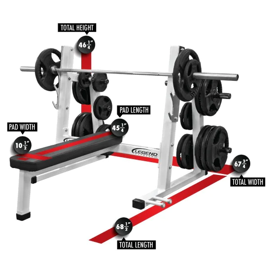 Legend Fitness 3240 Pro Series Olympic Flat Bench Press with Band Pegs – The 3240 Pro Series Olympic Bench Press by Legend Fitness Equipment is the most innovative and multi-functional weight bench Legend makes. Youll first notice the monster uprights fabricated from 3 x 3 x 11 gauge carbon steel. Set on an angle, they integrate well with the arc of the lifters optimal bench press bar pathway. The multi-level bar catch system is laser cut from a single piece of 3/8 thick carbon steel which is chromed to look great and be scratch resistant. These gun rack style bar catches accommodate preferred lift off heights of different size users and can come in handy in case of a missed rep. Dual band pegs located at the base of the frame just to the side of the lifter provide the opportunity to periodically change up your bench press workout by integrating rubber resistance bands for variable resistance presses. Simply choose your preferred band resistance level and loop one end over the Olympic bar sleeve and the other end around the band peg. As the bar travels from chest to lockout, your pecs will be challenged with increased levels of resistance. What good is a bench press thats built like a tank if the padding bottoms out on heavy lifts? For that reason Legend uses only the best 2 thick rebond foam that helps distribute the weight between the back and shoulders and wont deform. And the cherry on top of the 3240 is the large capacity weight plate storage in the back. In all, there are a total of ten weight pegs designed to hold lots of Olympic plates 2.5 lbs. through 45 lbs. Choose from several chip resistant powder coat colors and naughahyde colors at no upcharge. Need a custom color? Contact an Ironcompany Legend Strength Equipment specialist today.