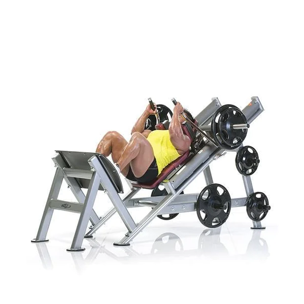Proformance Plus PPL-965 Hack Squat – The Proformance Plus Linear Bearing Hack Squat by TuffStuff offers an alternative to barbell squatting that attacks the quads more directly while supporting the lower back. Think of the hack squat machine as a hybrid exercise somewhere in between a barbell squat and a leg press. You move your torso through space as with a squat, which some in the exercise science community have postulated may stimulate positive metabolic changes like the production of growth hormone. You also receive the back bracing benefit of a leg press, as your back is supported throughout. With no forward lean due to the backrest, posterior chain involvement is lessened with hack squats. Though they do work the entire leg musculature, including quadriceps, hamstrings, glutes, and even calves, the rigid back position forces the quads to work the hardest. This offers a distinct advantage to bodybuilders and physique competitors seeking to bring up the quads, specifically the vastus medialis muscles.