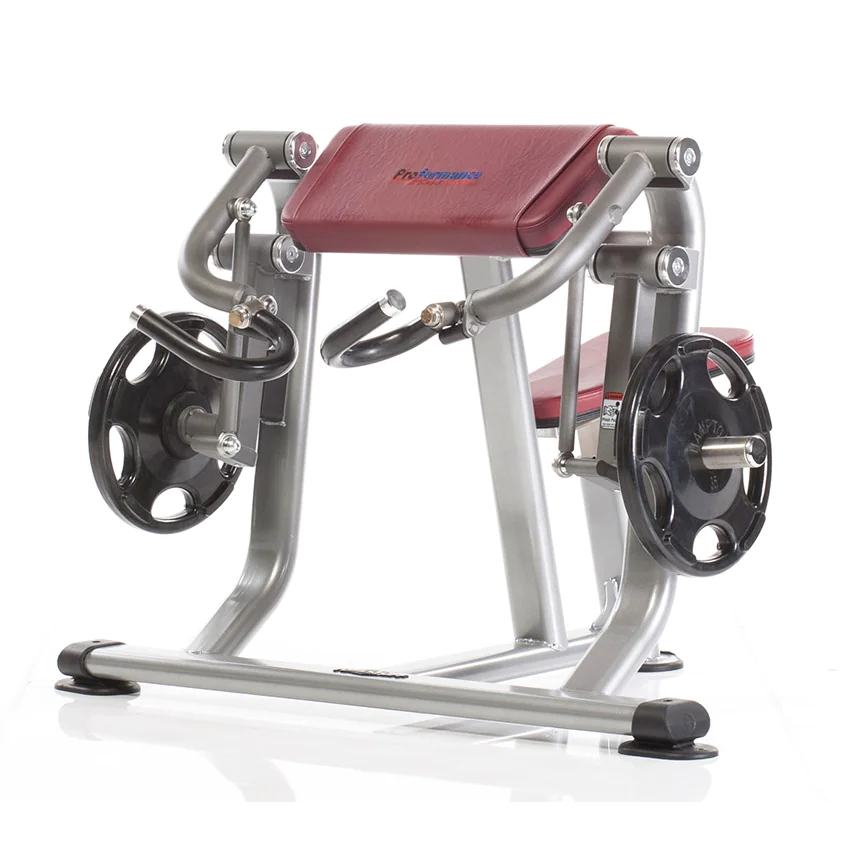 Proformance Plus PPL-920 Biceps Curl – The Proformance Plus Biceps Curl by TuffStuff offers superior balance and feel to free weight preacher curls along with the safety and convenience of a machine. Two important features of this plate-loaded biceps curl give it some clear advantages over a free weight preacher curl done with an EZ-curl bar. Unilateral arm movement, in which each lever arm moves independently, insures that the dominant arm cannot take up any slack for the weaker arm. In other words, whatever weight you load on the right-hand weight horn will be lifted solely with the right arm and whatever weight you load on the left-hand weight horn will be lifted entirely with the left arm. With free weights, the only way to mimic this independent movement would be to use dumbbells, which can be quite bulky to heave into position. Additionally, the swivel handles pivot to allow natural wrist movement throughout the full range of motion – another feature that could only be achieved with free weights by using dumbbells that would tend to awkwardly wobble and clang together during each rep. With the Proformance Plus Biceps Curl, even the strongest curlers can pile plenty of plates on the 8 weight horns to work each arm independently.