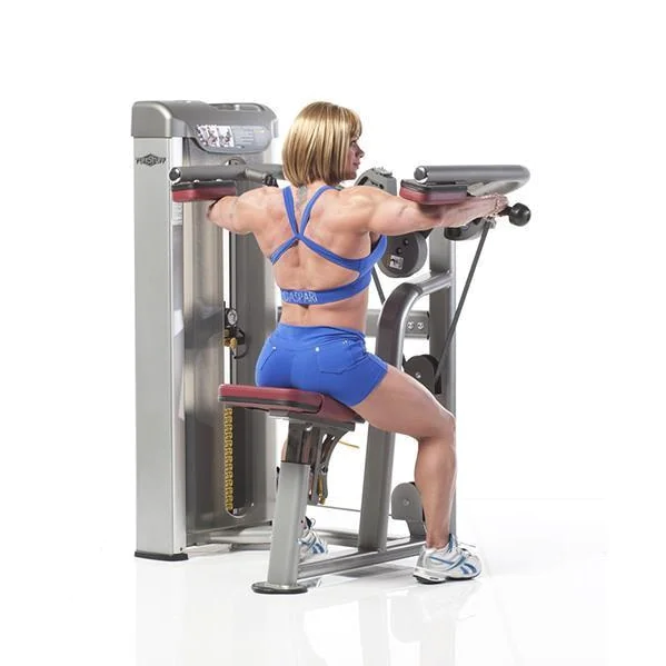 The Proformance Plus Lateral Raise ensures isolation of the lateral head of the deltoid. The seat not only adjusts for users of different heights with a gas-assisted adjustment, but it is also angled forward slightly so that the trainee is in a sound biomechanical position for lifting without having to resort to swinging to generate momentum. In addition, the Counter-balanced pivot arms provide smooth motion and low starting weight, and custom rope handles allow free hand movement and further ensure correct exercise application.