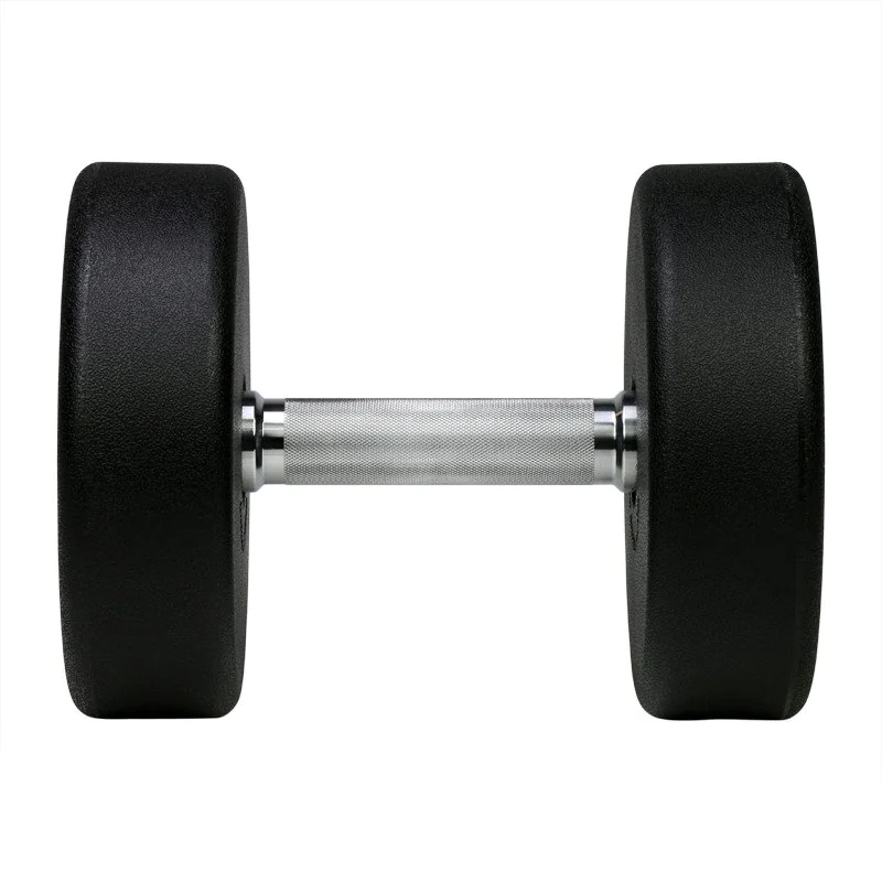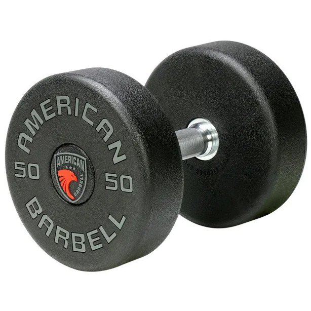American Barbell Series I Urethane Dumbbells were originally designed and distributed by GP Industries as the GP Series I Uni-Lock Dumbbell (DBS1) with nearly 2 decades of development, and continue to be produced today under the American Barbell brand name with the same industry-respected engineering and commercial quality. The dumbbell head features black textured premium-grade German urethane bonded to a solid steel core that is 90 times stronger than rubber, with easy to read permanently molded numbers in gray. It is designed to hold up in high use gym environments and does not show the wear and tear that gloss and non-textured urethane dumbbells show, ensuring that your dumbbells look as great as they perform over time. A larger radius on the outside and inside edges make these dumbbells comfortable to use in any exercise, specifically when the dumbbell comes in contact with your body. Add in the US made high-strength steel chrome plated handle with great knurling that comfortably fits any hand, and you will know you are using one of the best dumbbells on the market today. American Barbell premium German urethane is super tough and is bonded to the steel core, unlike the majority of dumbbells available today. Urethane will never dry rot and is odorless.