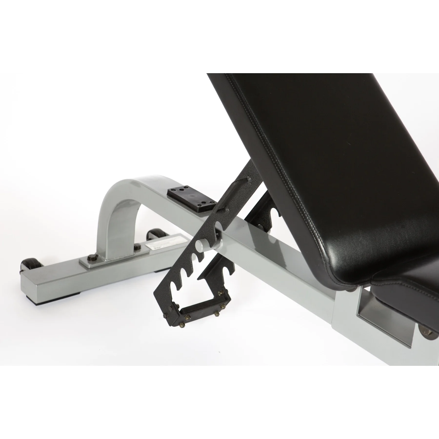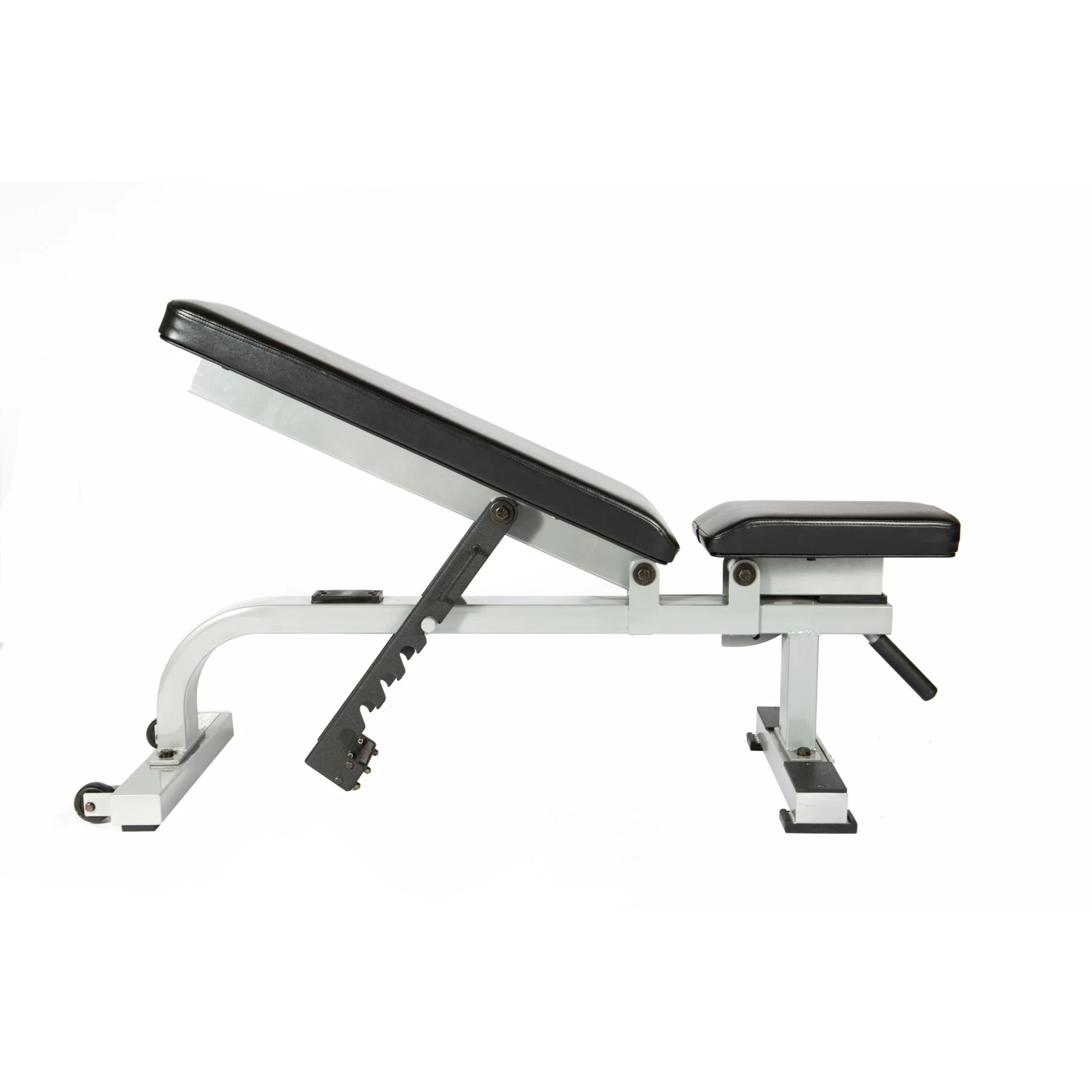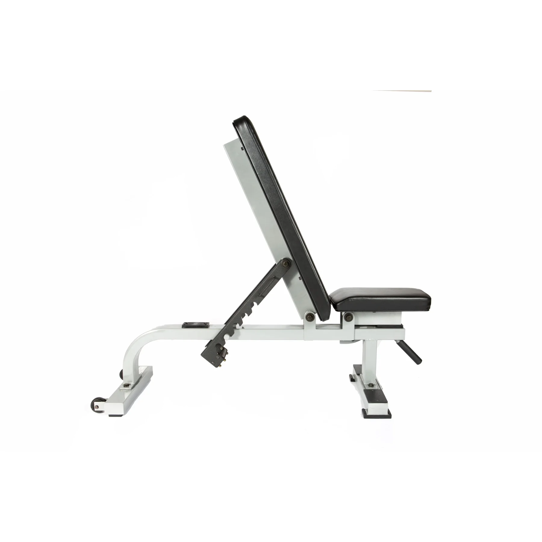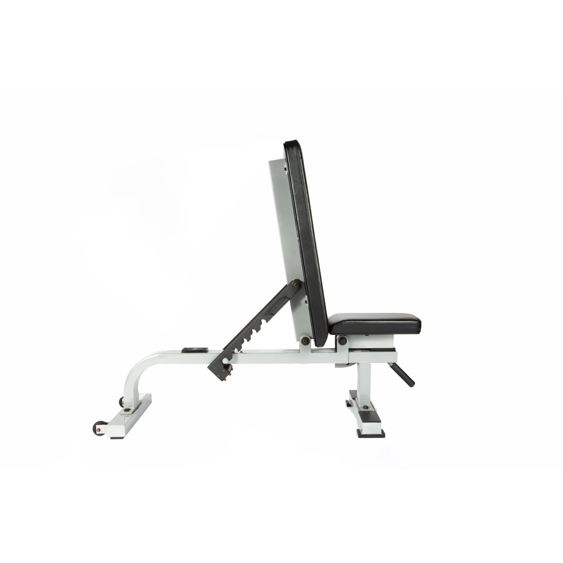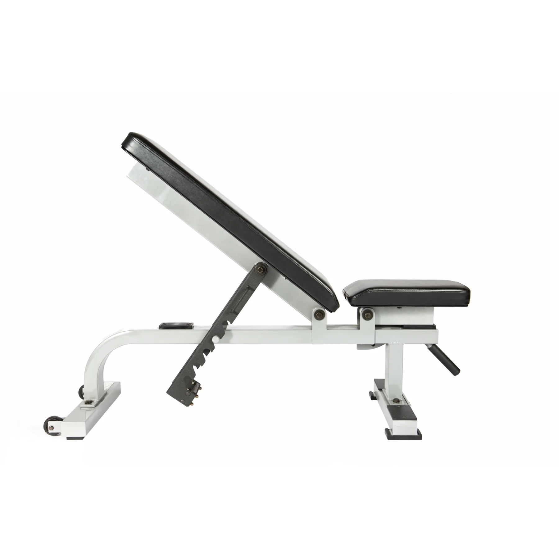 powder coating with your choice of white or silver. Dense 2 thick padding offers ample support and comfort even under heavy dumbbell and barbell payloads. Bench can be adjusted in six different positions from flat to 90 degrees allowing the user to train the chest and shoulders from multiple angles. A quick-adjust pop-pin underneath the front seat angles into multiple positions to keep the user in place and from sliding when performing incline exercises. And the included transport system includes a handle in the front and wheels in the back for easy one person mobility. Wheel your bench in front of a dumbbell rack or into a Smith machine or power cage. The training possibilities are endless with a versatile utility bench.