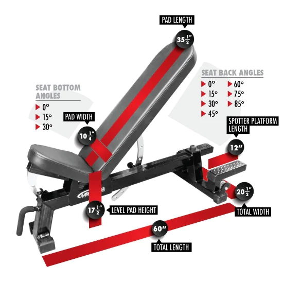 Legend Fitness 3216 Three-Way Utility Bench with Spotter Platform – The 3216 Three-Way Utility Bench with Spotters Platform by Legend Fitness is a commercial adjustable weight bench made to handle the heaviest payloads in a power cage, Smith machine or in front of a rack of dumbbells. Its pop-pin adjustable back pad lays down flat for flat barbell or dumbbell presses and graduates to 15°, 30°, 45°, 60°, 75° and 85° for training the pecs and front delts from different angles for maximum strength and muscle gains. An adjustable seat pad ranges from 0° to 30° and when inclined keeps the lifter from sliding out of the bench when performing incline presses. Moving your portable weight bench from dumbbell rack to power cage is easy thanks to the front mounted handle and rear wheels. Roll it over concrete or rubber flooring with just one hand!