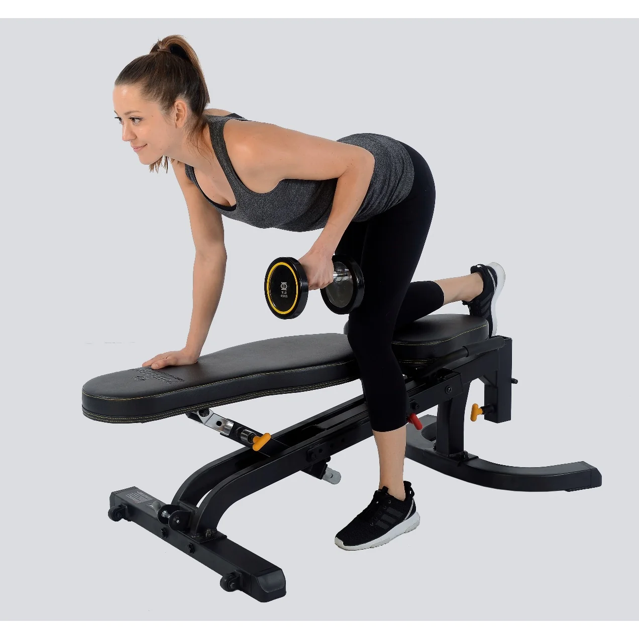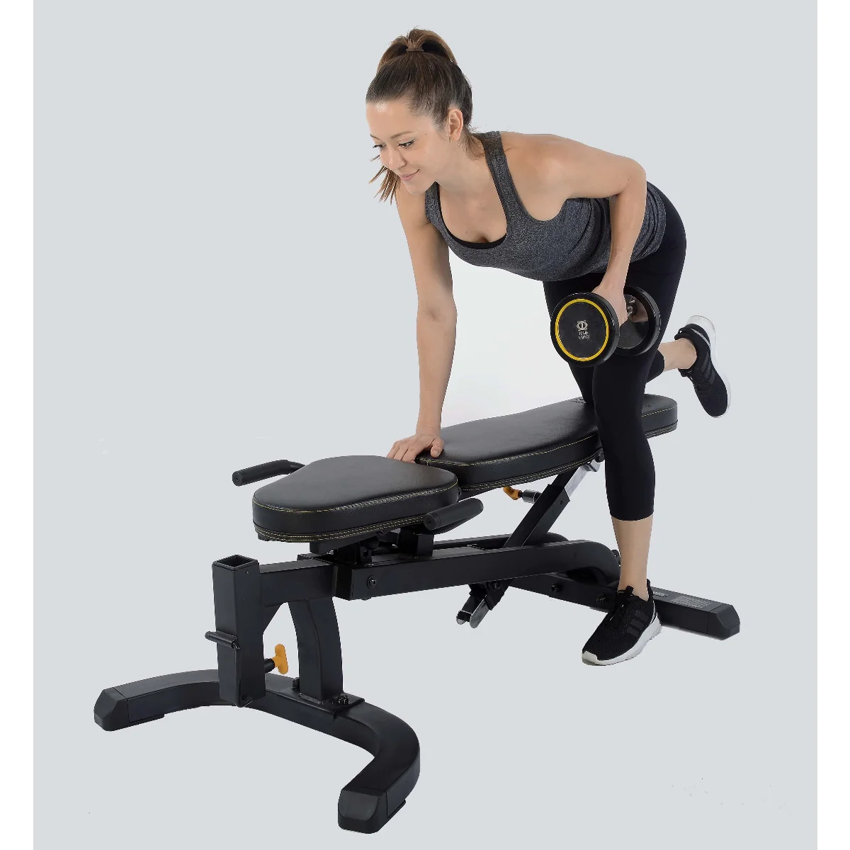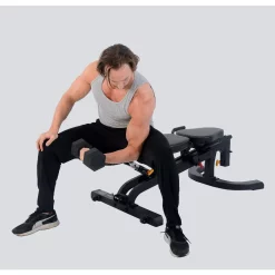 The leg lift attachment is optional and includes a swivel catch to lock your legs in place for abdominal work. You can also add an arm curl attachment as an upgrade for a complete bench system.